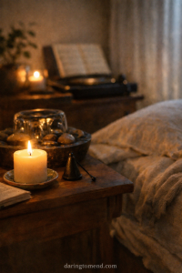 A candle holds the day in amber light, its small flame breathing slow and kind. Piano notes fall gently—Mozart-soft— meeting the steady murmur of running