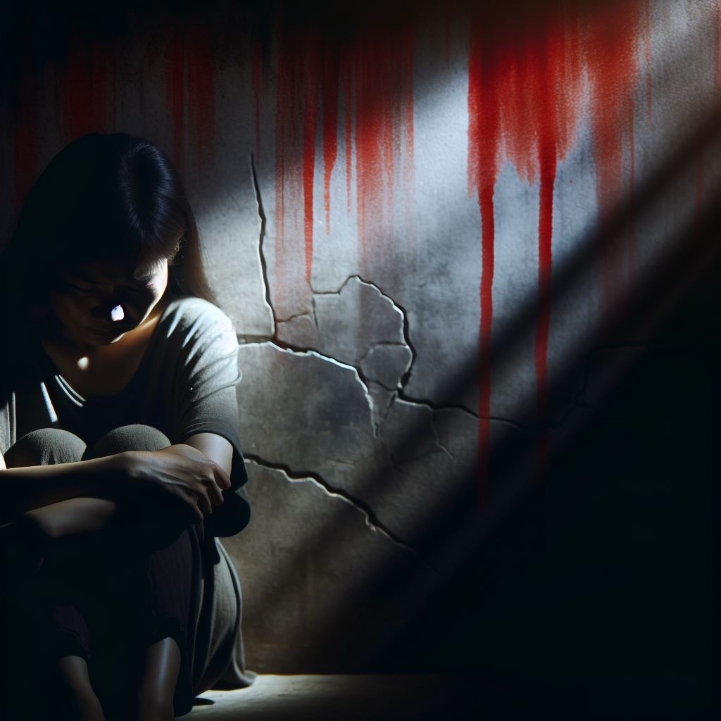 The background is stark and haunting: a cracked, aged wall looms behind her, streaked with vivid red lines that drip downward like bleeding memories or emotional scars. The red streaks are abstract—neither blood nor paint—but they evoke trauma, rage, and unresolved pain. The wall itself feels cold, almost alive, as if it’s witnessed everything she’s endured.